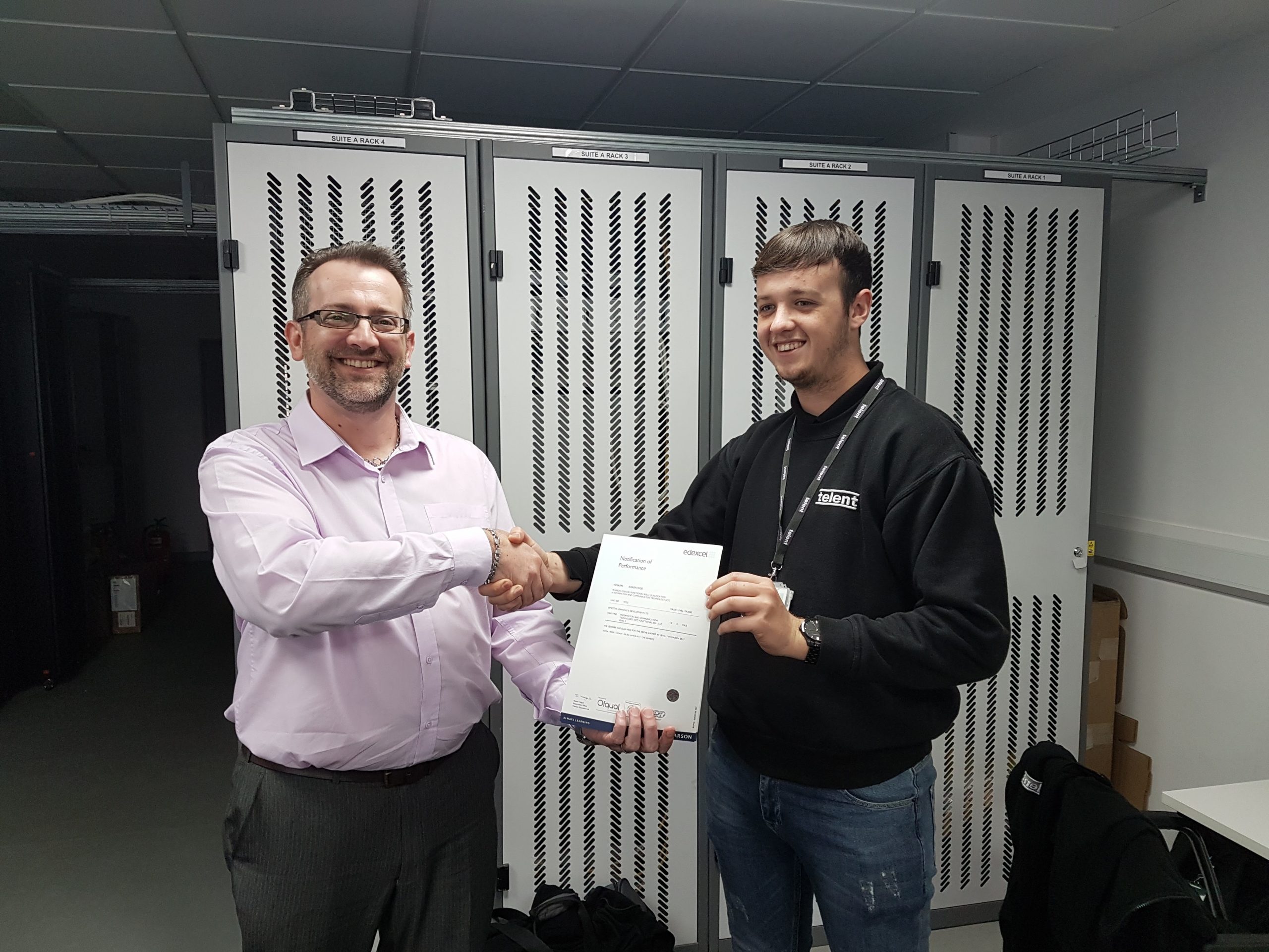 Congratulations to telent apprentice Kieren Wise for successfully passing his Functional Skills ICT Level 2. In the picture he is being presented his certificate by Semester Tutor, Gary Martin at the telent training centre in Heathcote, Warwick.